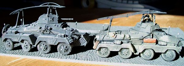 SDKFZ 263 I do not own the ALBY SdKfz 263 and im not even intending it to buy it. From the instructions I have it is about the same kind of kit like the SdKfz 232, just with another hull and the SdKfz 263 frame antenna plus the antenna mast. The MarS Funkwagen is likely the same kit too, just featering another body and antenna equipment. TAKE NOTE: This kit has no Zerschellerplatte as shown on the photographs of the built vehicle, its also missing the spare wheel, smoke dischargers and the jerry can. All other items are featured. SDKFZ 263 1:35 SCALE COMPARISON As you might have noticed, my SdKfz 263 is a DAK vehicle, it's sprayed in Panzergrau (Revell 78) and was oversprayed with Dunkelbraun (Humbrol 93). To be honest I was mostly inspired by Fabien Décamps "Funkwagen" article on the Missing Links site which deals about 1:35 solemnly. So I consequently lifted all his ideas and transferred them to my 1:72 kit, I hope he's not going to sue me :-). Unfortunately I was unable to make a direct copy of his fabulous kit (he plays in another league I guess) and to simply copy 1:1 would've been dull at all, so I modified it a little :-). Fabien used tactic marks for a Nachrichtenkompanie, which look really cool but I was unable to find some in 1:72 so I simply took a divisional mark and marks for a Panzerspähkompanie (ESCI) which makes the model a little more colourful. Talking about Swastikas: I'm no Nazi and it is really hard obtain the DAK Palm with a Swastika, (old ESCI Panzerjägerkit), I was hesitating to use these because I had never done this before and it is strictly forbidden to display these models in public. I hope your feelings are not being hurt by the use of historical correct DAK markings. I added the Zerschellerplatte from another MarS SdKfz 232. The sternantenne is also not supplied and was added by using wire. The paint seems to be worn off and scratched, I hope I did not exaggerate aging because this is the first feeling I have when looking at the model. I tried to spray less Dunkelbraun on edges just like Fabien did, after drying out I started scratching it off with scalpel and fingernails. I read a good article on Miniaturezone about Fe2O3 powder technique, my brother studies chemistry, so he passed me this stuff and I used it on the jerrycans (the only spot where rust can be in my opinion). SDKFZ 232 My built SdKfz 232 are both participants of the French campaign in 1940. I added the narrow white Balkenkreuze by TL-Decals (can be reached at www.TL-Decals.de). Tactic marks come from Matchbox Funkwagens and ESCI SdKfz 250. I drybrushed both with light grey and sealed the paint with clear matt varnish. I would not recommend using brushes to actually paint the vehicles as they are highly fragile and need to be handled with special care. I break off parts occasionally, thank god that there's superglue. I gave the wheels some angle so that the models don't look too flat and lifeless. Fixing wheels on the MarS can be real nasty and sometimes you need to cheat a bit to get a proper alignment. Basically I found the MarS kits harder to assemble (no wonder just look at the suspension) but more satisfying when I completed the work. DISADVANTAGES OF BOTH KITS The worst thing I found about these resin kits is that the hulls are one solid piece, they are nicely detailed but almost none of the hatches or vision flaps can be opened. Only ALBY's 232 features a hollow turret and seperated commanders hatch that can be displayed open. Now you have to think that visibility for the crew was always bad inside a SdKfz 232 especially for the driver, on most photographs you will notice that most of the vision flaps are open or at least the ones that surround the drivers seat. Now imagine you're not in central Europe but in the boiling sun of the northern Sahara, inside a giant of steel that seems to absorb all the heat, much worse than a car without air conditioning. You see what I'm aiming at: most photographs of African vehicles show them with all hatches and flaps wide open. This cannot be realised with both kits, neither engine or maintenance hatches, too.