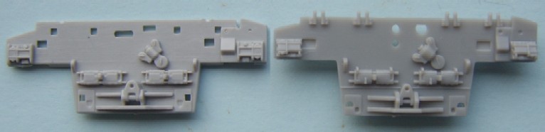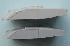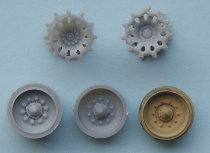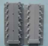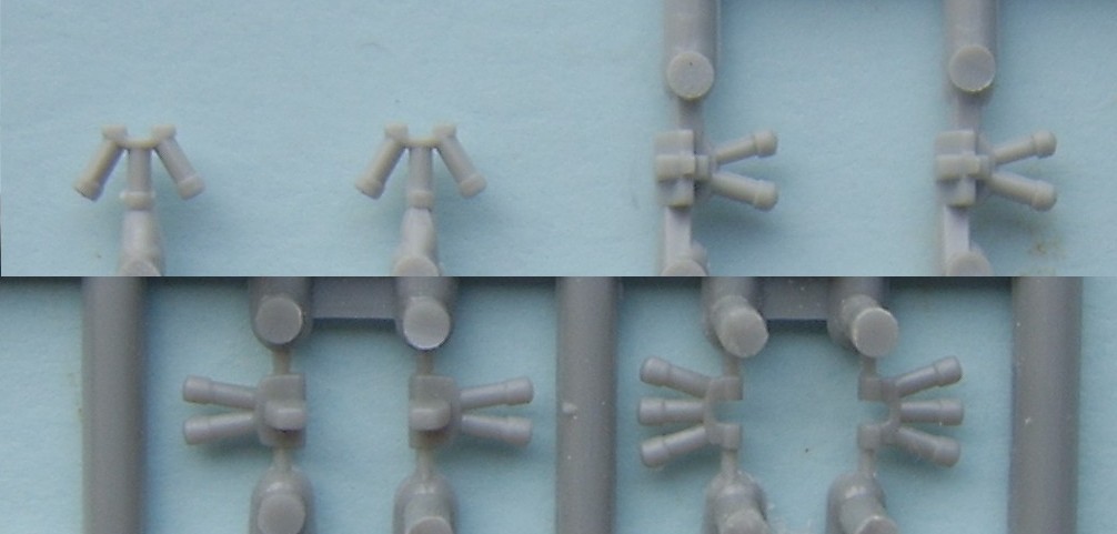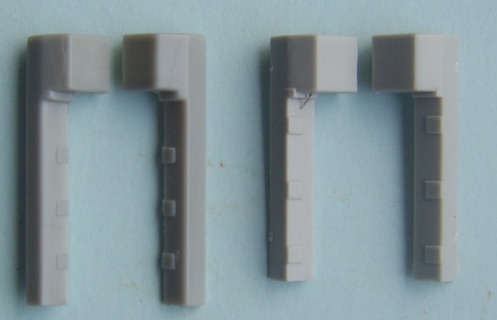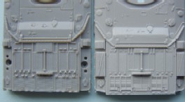 The Jerry can holder, as can be seen both a similar and both have jerry cans moulded in place, if I had to choose between them I would pick the Trumpeter, although for the first aid kit and telephone the Dragon one is better. The exhaust shrouds, the difference in length comes from the fact that the Dragon exhausts are in the wrong place, mounted too far forward on the hull due to the size of the engine deck. Both have a similar profile, but both sit slightly too high The add- on Armour, as can be seen the dust skirt on the Trumpeter kit is a separate piece, as the armour is also used for the KFOR version, to this end the frontal portion is a separate piece as the KFOR option is also different. The Wheels from left to right Trumpeter, Dragon and my favorite Revell, the Sprockets are reversed with Dragon being first The Turret With the Hull done the Attention turns to the Turret, at a quick glance the Trumpeter looks to be great, the gun sight is the correct shape and length, the sight mounted just to the left of the main sight has better relief than the Dragon kit and the loaders periscope is also better but if you look at the front plates of the turret you can see that the Trumpeter ones are noticeably bigger than the Dragon plates, the Dragon ones are correct. Turning the Turret on to it's side it becomes noticeable as to why the front plates on the Trumpeter turret are bigger, the Turret is squashed for want of a better phrase, the Dragon turret roof has the correct height, the Trumpeter side wall profile is correct at the rear with the stowage bin running parallel to the hull and not angled downwards as in the Dragon kit. the front portion of the Dragon kit has the correct profile for the Challenger with the Trumpeter one being incorrect in this area.The Trumpeter turret although correct in profile is slightly too long making the rear longer than it should be The Commanders hatch, although the Trumpeter hatch is moulded closed, the hatch is the better with the two round housings at the rear being the correct size compared to the oversized Dragon ones, here the best thing to do would be to remove the moulded in Trumpeter hatch and replace it with the Dragon hatch. The Loaders hatches, here Trumpeter have the correct hinge sizes, but the hatch is the wrong shape, the Dragon hatch is the correct shape but the hinges are wrong, the other hatch is the other type supplied in the Dragon kit The Gun Barrels are very similar, but the Dragon barrel needs to be turned 1/4 turn to line up the thermal sleeve, to explain this better the indentations on the Thermal sleeve should be in two groups of 3 with a larger gap between the two groups, the groups should be aligned top and bottom with the wider gap running down each side, on the dragon kit this gap runs along the top of the gun, on the Trumpeter kit it seems to need a 1/8 of a turn to line the gaps up correctly The gun mantlet and TOGS housing, this is the easy bit with the Trumpeter one having the correct shape size and profile and can be used directly as it is. The GPMG, here Dragon have the better rear ends with Trumpeter the better front ! just to be awkward, that being said the Dragon ones are very thin and to my eye too thin The independant commanders scope, this is good fun !! not ! Dragon have the correct height and trumpeter the correct width, it is easier to change the Dragon one by adding thin plastic sheet to the outside and replacing the bolt detail the Smoke dischargers, I think that here it comes down to personal choice, I find Dragon s to be better although others might see Trumpeters as better.