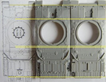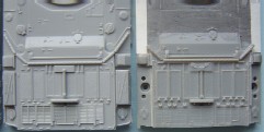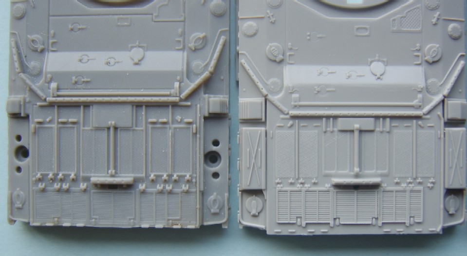 With the release of the Trumpeter Challenger 2 I thought that it would be a good idea to do a comparison between the two. Both are not perfect and unfortunately there is no easy fix for either of them. I suppose that until someone releases a good Challenger 2 the only way forward is to kit bash the two, but even that is not as easy as it first seems as it is not just a simple case of swapping parts, there are still alterations that need to be done and in the end it will come down to which is the lesser of two evils or how far the individual wants to go ! there are those who moan and do all they can about a Sherman that is not correct, or about a Panther or whatever it is they like the best, for me it is Modern British and Russian vehicles that I can not accept faults on when building a kit. In the following Comparison the Darker Grey is the Dragon kit with the lighter being the Trumpeter. The Hulls I will start with the upper hull size wise they are both the same and it is just in details that they differ, but it is a big difference. I have said before that the Dragon engine deck is too long and have even shown how to correct it HERE, for some understandably this may be a bit too much work. The good news is that the Trumpeter engine deck is the right length, unfortunately the rest of the details on the Trumpeter kit are very simplified, the Dragon deck is the better detailed but needs shortening and modifying on the rear right hand corner.The exhausts on the Dragon kit are slightly too far forward, this is rectified when the kit is altered, they are also slightly too small. I have also included the hulls against the Tankette drawings, showing how the two kits are different and how the Trunmpeter turret sits too far back from the front. Here you can see the difference in length of the engine decks the hull on the right is a modified Dragon hull, Closer inspection of the front will show that the two kits differ, here again the Dragon kit is correct A comparison shot of the Trumpeter and the Modified Dragon engine decks as can be seen the alterations have corrected the length of the engine deck. The Trumpeter and an unmodified Dragon hull, it is clear from this shot just how out the Dragon rear hull is. The lower hull, the Trumpeter kit has the correct wheel spacing's. The rear Plate, both have the same moulded on details. On both kits the fuel drums and their holders are moulded as one piece, the details are correct with the Dragon ones having a bit better relief but still not enough.