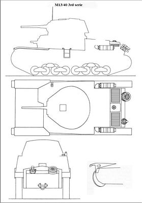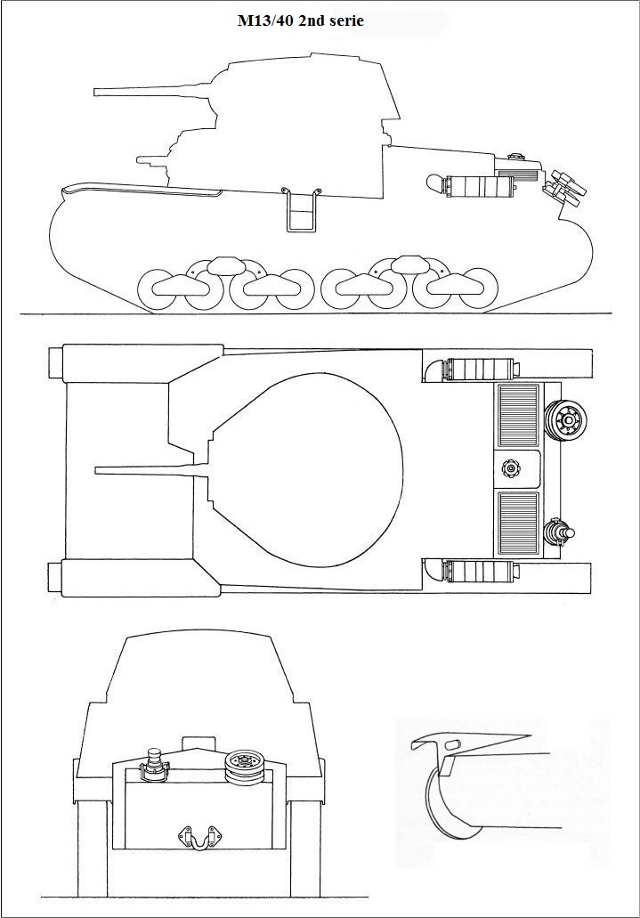 - (After 50th vehicle) return of long fenders, with reinforcement on the outer rim. Compared to long fenders of M13/40 1st serie, frontal edge was longer by 10 cm and had a longer curve radius. Since the 533rd vehicle, the small oval hole was hidden by a small romboid plate. No protection on lateral ladders.