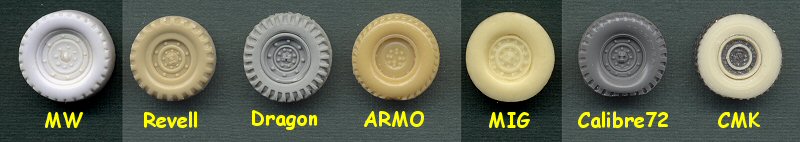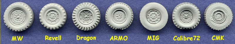 As mentioned, the MIG and CMK wheels have the aggressive tire pattern. All others are supposed to represent the standard tread. Regarding the size of the wheels, I had real difficulty in finding the exact wheel measurements for the two different styles of wheels shown here. The best I can come up with, and someone correct me if I am wrong, is that the measurements for the original style wheel are: 37 x 12.5 x 16.5. These measurements show tire outer diameter x tire width x wheel rim diameter, in inches (I saw one place list them with a 38 inch tire diameter, which I believe was a civilian tire). The newer aggressive wheels are narrower than the originals, but I believe the other measurements are the same. The only detail difference on the hub between the two wheel styles is more rim bolts on the aggressive wheel hubs. This table shows comparison measurements of all the wheels, converted to millimeters:
