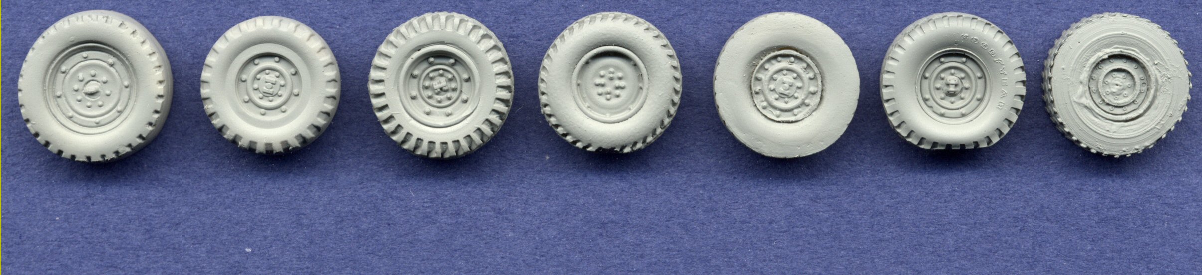 wheel. This past year, both Revell and Dragon released plastic kits of the ubiquitous HMMWV utility truck, and they were immediately followed by two sets of resin replacement wheels, one from MIG Productions and the other from the relatively new Calibre72. I have often seen questions on the forums of which were the better wheels, and when I sat down to compare them all, I remembered that these four were not the only Humvee wheels out there. The very first Humvee kits released were a series of resin kits from ARMO. Although they are older models (I think released in 2000 or 2001), they are also quite fine, and are superior to any other Humvee on the market when it comes to interior detail, including complete engines. A few years ago, Military Wheels (MW) released their own series of Humvees, the first time that they were made in plastic. Granted, they are limited-run plastic, which means that they will require a little extra work to clean up and assemble, but I'm building one right now and it's really not a bad kit (well, except for the wheels, as you will see). So, we have four companies producing Humvee kits: ARMO (several versions in resin), MW (several versions in limited-run plastic), Revell (two versions in plastic), and Dragon (many versions in plastic). We have two resin manufacturers selling replacement wheels: MIG and Calibre72, and we also have a resin and etched metal conversion set from CMK that includes replacement wheels. This gives us a total of seven wheels to compare. I've arranged the wheels in the scan with the three plastic wheels on the left and the four resin wheels on the right. I should have placed the MIG and CMK wheels adjacent to each other, since they both represent the new "aggressive" style of wheel, but I didn't think of that until now. All other wheels have the original tread pattern. MW and Revell are both plastic wheels, while the Dragon wheel is a rubber tire stretched over a plastic wheel rim. ARMO, MIG and Calibre72 are one-piece resin parts, while the CMK item has separate resin wheel and tire parts, with the tread and wheel rim details provided in etched metal. This following scan shows the same wheels after priming them all in light grey to better compare their detail: As you can see, the CMK wheel looks really bad because of superglue that I had slopped on the tire during construction, which I didn't notice until after painting it. I was thinking of going through the effort of cleaning it up, but I really don't think I'll be using these wheels anyway, so why bother?