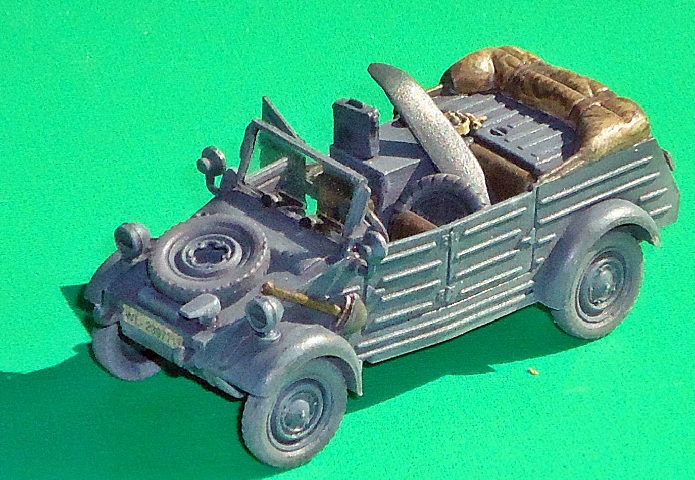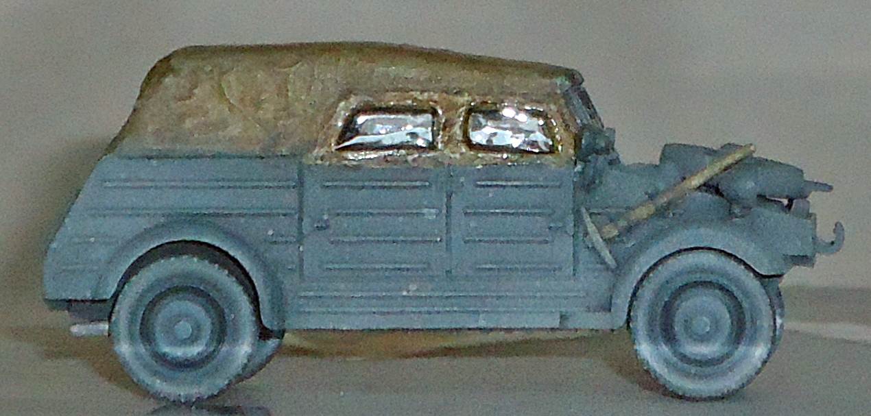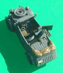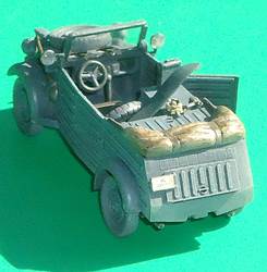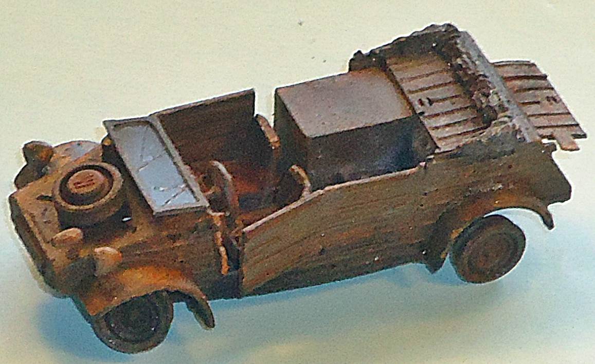 got wrong. The parts are very fine (the walls of the hull are much thinner than the available plastic kits) and with nice and abundant detail. Unfortunately warping and pinholes are present, while the ribs on one of the doors doesn't line up with the rest. While this can be taken care of with a certain amount of TLC, what finally made me relegate the kit to the status of shelf queen, was the roughness of some of the parts, which became blatantly apparent after priming. Sanding is an option, but with the corrugated nature of the walls of the hull and around some of the finer details, I felt unworthy of the task at hand. Some time after having promoted the kit to shelf-queen status I was in need of a wrecked vehicle to fill a void in a diorama. Given the roughness of the kit, I felt that it would be a good basis for a burnt-out vehicle. A couple of bullet holes were added, a fender bent and the upholstery of the front seat replaced by springs made from copper rod. Wheels from an Academy Kübelwagen (which are too small) were sanded down to serve as burnt-out hubs.