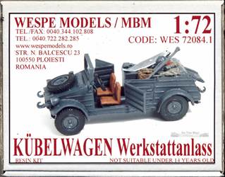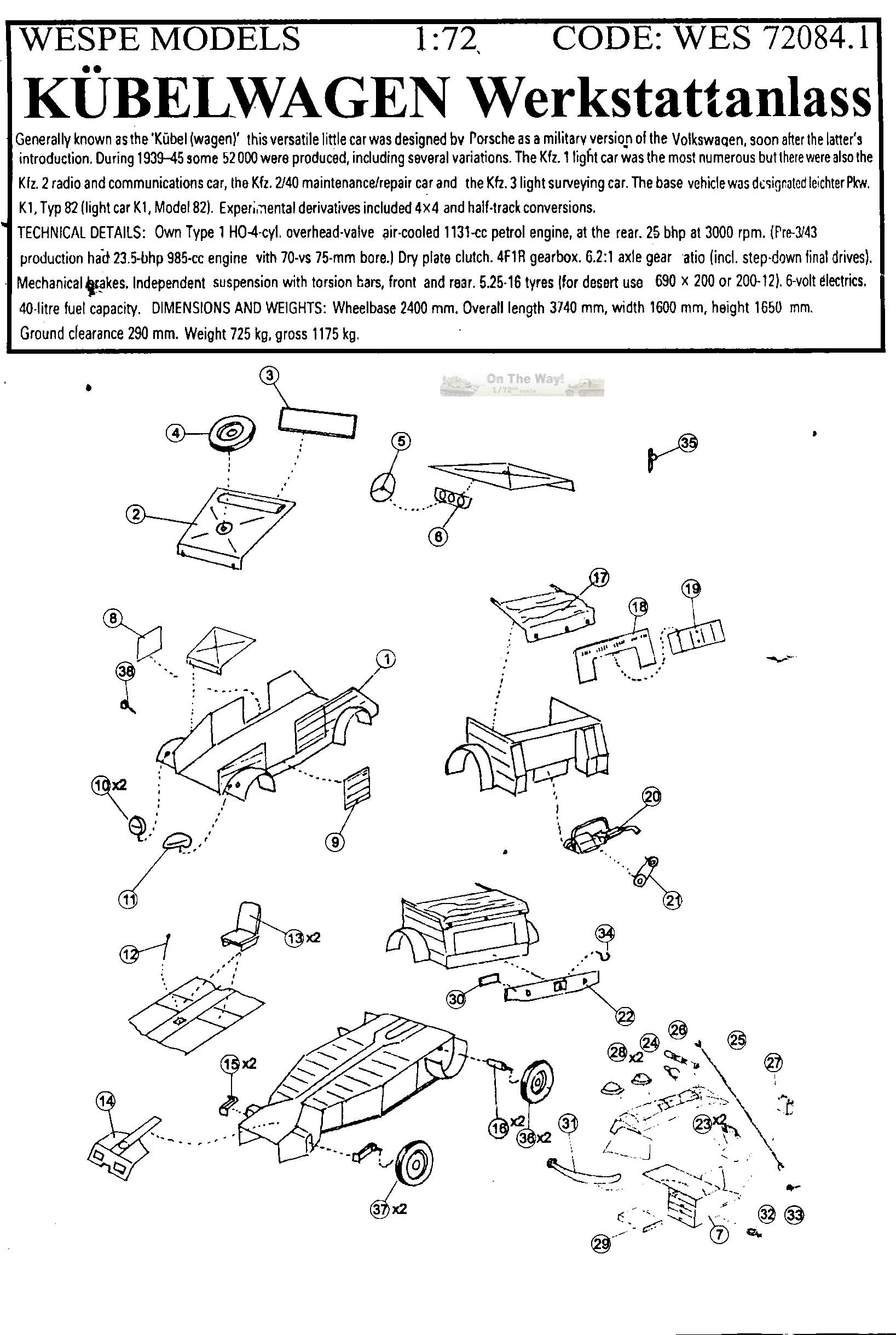 1. The Wespe kit Wespe from Romania makes this resin rendition of the ubiquitous Kübelwagen. The kit is packaged in a small cardboard box with the illustration glued to it. The one-page, one-sided instruction sheet is shown on the right. It is hand-drawn, and not always evenly copied. As this is a simple vehicle, most parts naturally go to their correct place. Unfortunately the part of the manual that is least clear is where the workshop-specific parts are installed. Fortunately the image on the boxtop can help. Here is the layout of the parts for this kit. The way the kit is packed is original: all resin parts are individual pieces (i.e. not attached to molding carrots) and glued to a paper backing with a silhouette of the part. This makes it easy to check whether all parts are there. At first I thought some parts were missing, but they had simply detached from the backing and were found in the corner of the sheet. The plastic wrapping ensures that pieces are not easily lost. A big advantage of this method (and I have no idea how Wespe does it) is that there is next to no clean-up of molding carrots to be done. While this necessary evil is mostly a wild bore in most kits, here it is limited to an occasional film that protects fragile parts (e.g. the open area in the sidewalls where the doors will come). A minor disadvantage is the need to carefully remove the glue that is used to secure the parts to the backing. A (véry