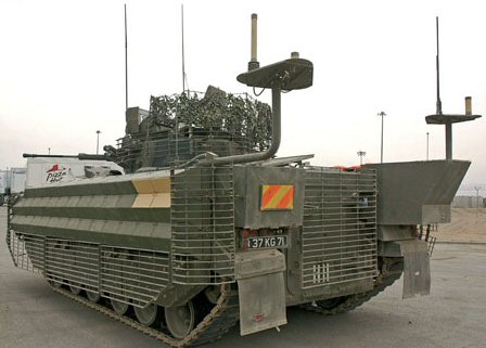 The MRV has also been seen fitted with Chobham armour panels down the sides. On the right-hand side it is the same as the infantry vehicle, which allows no access to the stowage bins behind. On the left-hand side it is the same but the panel stop at the NBC compartment to allow access to the crane. Bar armour is also fitted, but has a slightly different arrangement near the crane allowing access to the controls. No bar armour is fitted to the rear. The vehicles mount the same frontal armour as the infantry vehicle with the A frame being mounted on the front of the armour.