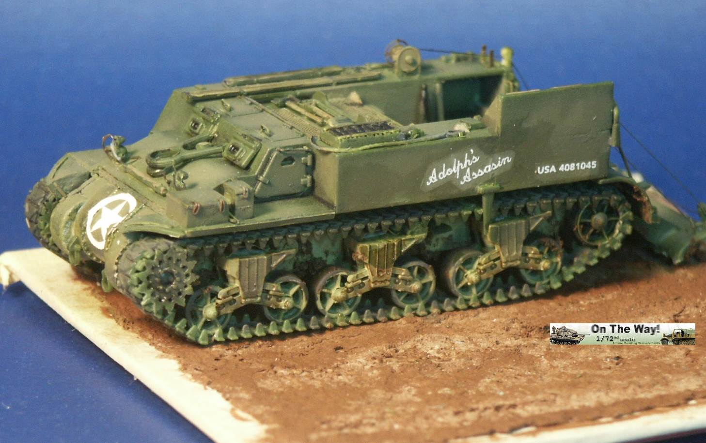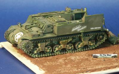 between the two pulleys. This photo shows a better view of the winch and pulley system for lifting and lowering the spade (assembly Step 13) in the back. There are etched brass tread plates (parts 2F) on the steps of the spade; a nice touch. Left of center on the starboard side of the superstructure rear we can see the double pulley made from white styrene bits and which replaces part 11C). Yes, there are still two track links missing from under the last roadwheel on the starboard side, these will come soon. The vehicle is mounted on a base with simulated earth and will be portrayed next to the UM M30 model. The earth is made from CelluClay instant paper mache tinted with brown acrylic paint. The nice simulated wood-pattern edges of the base material are protected from the paint with painter's tape. View of the front, the bow Mr. Surfacer 1000.has been painted over the differential cover to simulate a cast texture, even though in reality we would not be able to discern a Sherman's cast metal texture in this scale without a strong magnifying glass. At the upper edge of the 3-piece differential cover is UM's row of bolts simulating the bolts holding the differential cover to the glacis plate of the Sherman. This is a feature on all of the ten or so UM Sherman kits I have. Note the grab handles on the hatches fashioned from brass wire. On the gunner shield on the port (left) side of the gun are some etched brass parts. On each side of the upper hull sides a tad below the driver's visors are the homemade lifting rings missing from the UM and the ESCI M12 kits. Not very visible are UM's etched brass headlight guards (parts 19F). These brass guards are a nice idea but they bend out of shape so easily; it is difficult to not deform them. I found the Eduard and the Dragon etched brass headlight guard parts to be more substantial in that they are a little stiffer and hold their shape better. A view of the rear displays the little added details like the rings to support the upright artillery rounds on the floor. The cables for the spade hang loose but should be tighter when the kit is glued down. The monofilament line can be tightened by carefully heating the line with some gentle heat such as a hairdryer; but be very careful to not overheat and deform other parts. Perhaps one could insulate surrounding plastic parts with tissue. In historical photos there is some slack in the cables, as long as the cables hang down, the way gravity does with things. Skipping ahead several steps, several coats of paint and a dark wash have been applied followed by clear acrylic gloss over the decal areas. These markings are for the US Army 991 Field Artillery Battalion serving in Germany during the autumn of 1944 (see here). I should have chosen markings for the same unit as the UM M30 model to be mounted next to this model. I chose the markings based on what I thought looked appealing to me but should have considered consistency of the vehicles serving together and mounted on the same model base. I found that the UM kit decal markings are a little stiffer than decals from other manufacturers such as Revell and Trumpeter. One marking broke when trying to remove it from the paper sheet. Notice how the decals have a flat finish and the decal film certainly stands out from the gloss finish applied underneath the decal. Because the decals were extra stiff I found that they required an extra strong (hotter) decal setting solution. The star decal on the nose was a little too large based on the historical photos and curved up over the flanges and bolts of the 3-piece bolted differential housing making the setting solution absolutely needed.