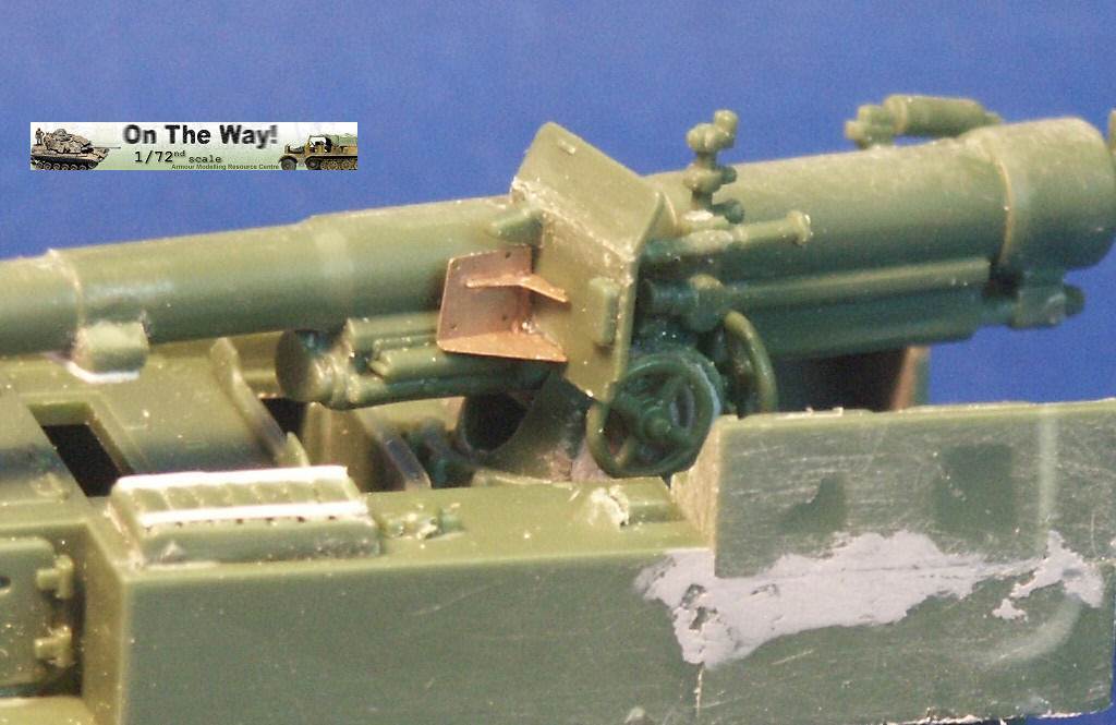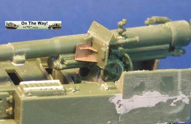 for me I finally heard from another modeler who had the same problem. The UM lower hull for their M12 and M30 assembles in a similar way to their M4 Sherman model kits. Notice that at the very rear of the gun compartment floor (part 10C) I had to fit in a fillet of white plastic to fill in a gap. The UM M12 kit 211 upper superstructure has fewer parts for the main superstructure than the ESCI M12 model but has considerably more parts for the interior and for the tools and gun. Notice the gray model putty to blend in the seam for the parts 33C and 12H. Notice that the gun has a white scratchbuilt replacement brace for a gun pedestal part (part 29H) that I lost. In the forward area of the gun compartment we can see one of the square air cleaners for the engine. The UM M30 kit comes with round, cylindrical air cleaners; I think it was a nice attention to detail to not just give the two kits the same air cleaners. The M30 and M12 were based on essentially the same hull, but in historical photos I have seen many little variations in the wheels and fittings. The gun shield (parts 24C) for UM's M1917 gun appears much more accurate than the ESCI part 16 and is enhanced by nice etched brass parts. The grouser box (parts 3H) has been given two strips of styrene to simulate the braces to hold the grousers in. The UM M12 model features a well rendered gun sight that is not supplied in the ESCI M12 model. The details on the UM 155-mm gun compare well to my reference photos, so I used it to help correct the details of the ESCI gun. An easier way to get a better gun for a great display model is to use the M1917 155-mm gun from one of the RPM GPF gun kits (see this review). The rear spade for the M12 is assembled except for the etched brass tread plates. Notice the scratchbuilt brace on the forward mudguard (fenders). Both mudguards on each M12 and M30 will need these braces. With the upper hull largely molded as one piece, the UM kit is missing the line of rivets along the upper edge that is present on the ESCI M12 model. Looking where the upper hull meets the final drive assembly I am unhappy about the fit; despite sanding and some trimming the upper hull sits too high, or the final drive assembly sits too low. A comparison of the UM wheels with the ESCI wheels shows the greater number of parts used in the UM suspension and the overall better rendered detail of the UM parts. To be fully frank, the UM suspension, though better than the ESCI parts, are still not as well done as the Dragon and Heller Sherman VVSS bogies and wheels. These are the same suspension parts as included in the UM and the ESCI M4 Sherman Medium Tank kits. Above and below are photos of the VVSS bogie assemblies used for my M12 and M30 models. To add some variation the two vehicles were given different wheels. Closure views of the UM bogies in various stages of assembly and different roadwheels, and variations in the track skid. The underside of the hull is the same as in UM's M4 Sherman model kits. Without having seen the underside of an M13 GMC, I surmise that this underside is incorrect as I suspect the engine plates should be in the hull center since this is a mid-engine vehicle. Compared to the 1/72 scale UM M30 kit built in conjunction with this M12 model, with the M12 I opted for an early variant with the open spoke roadwheels and idler wheels and early style track skids. The front mudguards have been given a scratchbuilt brace on both sides, the storage boxes have been given new lids, and the grouser box has been given two braces on top. The light gray model putty filler is obvious where part seams needing filling. At this point we have skipped ahead: what is new is the strip of plastic at the front, simulating the strip of sheet metal for hanging the side sand skirts, like those seen on the Sherman tank. The strips had a horizontal line of bolt holes. In historical photos I have never seen the side skirts actually fitted to an M12 or M30. A Heller kit open spoke idler wheel (the pale gray wheel at the rear) has been substituted for the UM idler wheel (part 3A). On top of the superstructure is a tow cable made from string and mounted to the deck. Neither the UM M12 nor M30 include the towing cable. The