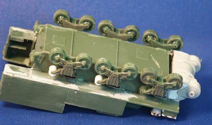 article till after I completed my models. All the M12 and M30 were produced with the 3-part bolted final drive assembly cover. Near the headlights are what appear to be lifting rings on the side of the superstructure. I have seen these lifting rings on both the M12 and M30 in most, but not all, historical photos of the vehicles. Neither the UM kits or the ESCI kit include these lifting rings. The UM M30 kit 226: we see the forward part of the upper hull is the same as the M12 but the M30 rear section of the hull is redesigned for significantly more ammunition storage. Sitting on the deck of the lower M30 hull is a storage rack of 56 artillery shells (parts 2C). The long vertical tubes I suspect hold the cartridges and propellant. Good reference photos for this vehicle are uncommon; on the ones I have, it shows the ammunition tubes stored horizontally. Using major surgery on the lower hull (parts-10B & 11B) the front parts for the final drive were cut off to prepare for a replacement final drive assembly. In the past I've assembled two of UMs final drive assemblies and I was not looking forward to building one again (see my reviews of the UM M12 and a UM M4A4 kit to see what I refer to). To the right is an extra resin 3-piece bolted final drive housing made by Wee Friends that I will mate onto the plastic kit. Mating this resin part to the plastic kit is easier than assembling another UM final drive (parts 15, 64, 65, 104 & 105). The back of UM's stamped type roadwheels (parts-5A) are hollow so considering that some contest judges like to look under the model, the hollow well was filled with white glue. Below are the forms included in the UM Sherman kits for bending the brass light brush guards (parts-8F) and the track skids into shape. At the bottom are some etched brass skids bent into roughly the shape for mounting on the VVSS bogies (at upper right). The Wee Friends resin final drive part has been glued on with super glue and a big gap is supported with some blocks of styrene. Several of the return rollers had scratchbuilt return rollers instead of the kit parts-6A. The hull bottom is missing a few details but does have the escape hatch and is more accurate than the ESCI kit.