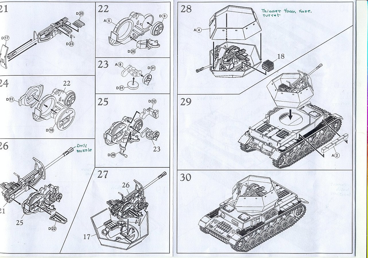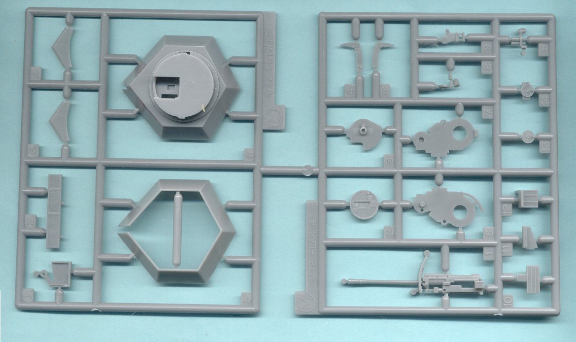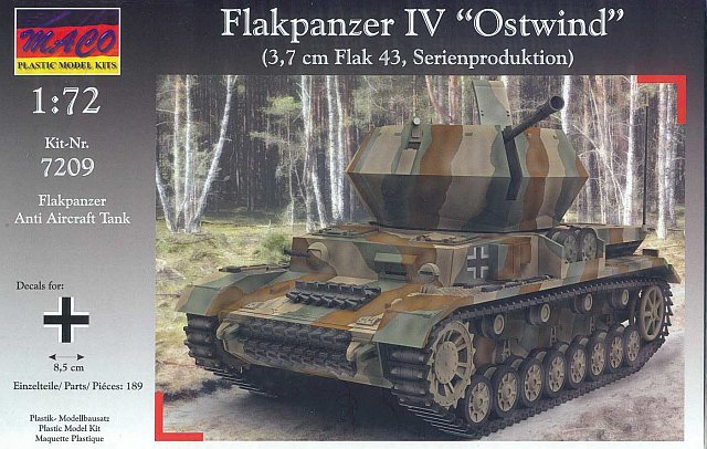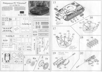 Manufacturers In the two photographs above, the left sprue is the Sprue-A, which is particular to MACO's Ostwind kit containing the 6-sided open-top turret (parts A4 & A5), some Flak 43 parts particular to the Ostwind kit, and the modified Pz IV upper hull (part A1). Why not use the Revell Pz IV hull you ask? Look at the placement of the radio operator hatch and you will see that it has been moved forward to make room for the Ostwind's larger turret ring so the engine hatches could be opened with the larger turret. The molding looks very good and the turret shell appears very thin. The right sprue is Sprue-D for the 3.7cm Flak 43 which is common to the MACO kits 7202, 7206 7211 and others. Molding and detail are very good. Many parts appear very delicate so be careful when cutting them from the sprue. Some parts such as the gun base (part D1) and the shield (parts D33, D34 and D35) are not used with this Ostwind model. Like with the Hasegawa kit we will need to drill out the muzzle of the gun barrel. In the two photographs above are Sprue-L (left) and Sprue-M (right) for Hasegawa's Ostwind and turret and Flak 43 gun respectively. The turret (parts L5 and L6 ) is the same basic shape as MACO's though the plastic is thicker. One of the first things I noticed when comparing the Hasegawa and MACO models was the significantly greater number of parts in the MACO kit. Hasegawa's molding quality is very good, though the detail is simplified compared to MACO. This Hasegawa kit includes their stock upper Pz IV hull that was used with the Ostwind prototype, not a hull with the revised radio operator hatch location. Though not typically seen after the model is built, it is clear that the underside of the Revell Pz IV (at left) is significantly more accurate than the Hasegawa kit. Both lower hulls are made of four parts, in contrast to Trumpeter's and Dragon's Pz IV hulls, which are slide molded in one piece. At this stage the gray Hasegawa hull looks significantly longer than Revell's. The wheels and tracks for these two kits (Revell/MACO tan sprue, Hasegawa grey sprue-K & black tracks) we have seen before in the Revell and Hasegawa Pz IV model kits. Revell's roadwheels look more correct and assemble well (I prefer to assemble and paint my wheels while still on the sprue). Hasegawa's roadwheels are the type with cast hubs as seen on the Pz IV F and G while Revell's roadwheels have the forged hubs as seen on the Pz IV H and J. Hasegawa gives us a choice of two different styles of sprocket wheel: mid-production (for a Pz IV F or G) or late production (for a Pz IV H or J). Revell's sprocket wheels are the late war type. Both offer the same style of idler wheels. MACO provides Revell Pz IV link & length tracks which I find a little thick but well done. I would prefer for MACO to provide some of their own Pz IV tracks I have heard good things about. The Hasegawa soft band tracks are dismal and are best covered in snow or mud for a display model. (CMK, MACO, OKB GRIGOROV companies and others make aftermarket Pz IV tracks in 1/72 scale.) At the top of Hasegawa's sprue-K we can see 3.7cm ammunition clips (parts-13) for the Ostwind and a spare 2cm cannon barrel box (part 15) for Hasegawa's Wirbelwind model, and an antenna mount (part 14). Assembly Instructions Both MACO and Hasegawa offer parts diagrams within their instructions. The 30-step MACO instructions appear complete and clear. For this review the pages of MACO's assembly instructions I have included here mostly cover assembly of the Ostwind turret since the Revell Pz IV parts are included in other kit reviews. The spent cartridge tray (part A10) shown in Step-16 has a wire basket in my photo references that we may wish to scratchbuild. On the parts diagram at the left in the above picture, the unused Revell parts are not shown, but most all are still there on the actual sprues giving us a bunch of extra Revell Pz IV H parts to play with. The MACO Flak 43 instructions look pretty clear. Note that with both kits it is advised to assemble all the turret interior parts before attaching the upper turret half. Some fine weld beads along the many welded edges may be a nice touch. While the spare roadwheels here in Step-30 are mounted on the port side like as seen on the Pz IV, a reference photo of a production Ostwind shows the two roadwheels mounted on the corners of the rear plate which is an interesting variation, similar to the Stu.Pz.IV Brummbar Sd.Kfz.166 spare wheel storage. Hasegawa's instructions have fewer steps reflecting the fewer parts and standard format for most 1/72 scale Hasegawa armor kits. Since this kit represents the Ostwind prototype the chassis is a standard Pz IV Ausf. G. For reviews of the Hasegawa Pz IV kits try here and here. I did not include a scan of Hasegawa's parts diagram but my kit included all the parts for a full Pz IV Ausf F2/G (compete turret and gun) model. MACO's color painting and marking guide above is typical of MACO small scale models and displays two Ostwinds with both the same 3-color hard-edge camouflage scheme, the only difference is that the bottom vehicle has no balkenkreuz markings. The small decal sheet also includes markings for the MACO Modelwagen and Kugelblitz kits which will go unused for the spares box. Hasegawa gives us a black & white drawing of their Ostwind which is typical of Hasegawa small scale armor kits. The 3-color camouflage scheme on the turret is a different pattern than on the chassis which likely reflects that it's a rebuilt Pz IV chassis modified to carry the Ostwind turret. The only marking appears to be small unit marking (decal number 2). There is no balkenkreuz or number markings to be used. This decal sheet is shared with the Hasegawa Wirbelwind kit and most of the markings go unused. A nice feature of this decal sheet is that with a little extra decal film coating over the kit title at the bottom, it can be slid off and placed on a display base for the completed model. Conclusi
