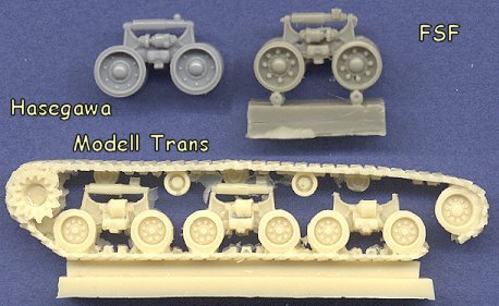 improving. One of the many gaps still remaining in Sherman availability however, are kits of the late war versions with the HVSS (Horizontal Volute Spring Suspension). One of the oldest plastic kits on the market, the Hasegawa M4A3E8 Sherman, was equipped with this suspension, but like the rest of that kit, the wheels and bogies are over-scale. No other plastic manufacturer has yet provided a replacement. Some resin companies have marketed a few HVSS Shermans, and they have all taken one of two routes in producing this suspension: they have either used modified Hasegawa kit parts, or they have used modified parts from the Matchbox 1/76th scale M40 (or M12?) HVSS kit. Unfortunately, neither of these solutions is appropriate for a good suspension in this scale. Fine Scale Factory sells three versions of HVSS Shermans: an Israeli M-51, an M4A3 with winter tracks, and a late-WW II/Korean-era M4A3 HVSS. All three of these kits use a modified suspension from the old Hasegawa kit. In order to improve upon the over-scale Hasegawa wheels, FSF reduced the diameter of the wheels by thinning the tires. This has indeed brought the overall size of the wheels closer to correct for the scale, but they do, however, look a little strange with a large wheel but very thin rubber tire. Still, it is certainly an improvement over the Hasegawa parts. (They also improved the bogie suspension a bit and added nice bolt detail to the wheel rims). Several companies have used Matchbox HVSS parts for their Sherman kits, including Modell Trans, Exokit, and Ca.Ma. Unfortunately, these wheels and suspension parts are far too small for 1/72nd scale.