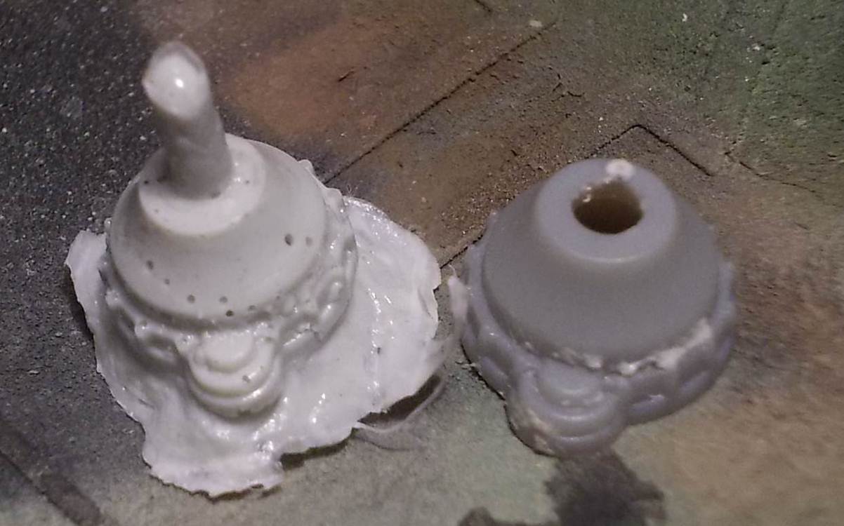 did). What do you do? Suppose now that you go for option 3. After a while you discover that the customer service the retailer/manufacturer pretends to offer is not what it is claimed to be. Then what ? Here is a simple solution, assuming you have access to a copy of the missing part. (This can be either because this part should be included n times in this kit (n > 1), but you only have it n-1 times, or because a friendly modeler trusts you to borrow his part.) In the example here, I am trying to make a copy of the sprocket mount of a Tiger I that was missing in a plastic kit from an unspecified Chinese manufacturer, but didn't send the replacement part that was promised after sending an email. I assumed that the left and right mount were (near) identical, so I decided to make a copy of the other mount. I first made a cast using regular DIY silicone. After a day or two I removed the plastic part (which should be fine after this ordeal). In the meantime I had taken a small jar, filled it with pieces of styrene sprue and Methylethylketone (MEK). After a day or two, the plastic has dissolved into a slimy paste, a bit like Mr Surfacer. (Adjust the amount of sprue to have a viscous mix.) Having removed the original part (quite important that you do), I now poured the mixture in the cast. After it has dried, the mixture will have shrunk substantially, so you will need to top up. (Do all this in well-ventilated area: MEK is highly toxic.) I let it dry overnight and removed the part. Depending on how much care you applied, you now have an exact copy in styrene, so easy to handle. As you can see, mine has some airbubbles, which - it seems - is unavoidable, but at least I have a new part. Some cleanup is needed on the open end of the cast. |