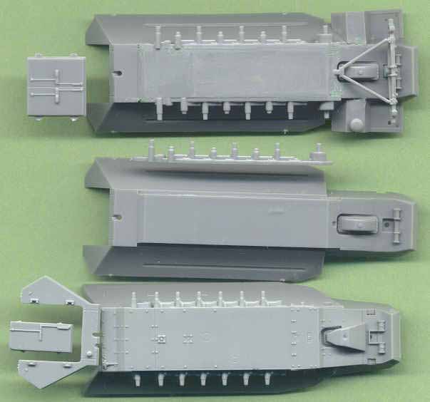 III. The Superstructure Parts At the top is the Hasegawa hull superstructure consisting of parts A6 and the front driver’s plate [B6] with open visors already glued in. Below Hasegawa's superstructure is the DML superstructure [part A1] in the slightly lighter gray styrene, also with separate front plate with open visors [part A18], and separate nose armor plate [part A13].