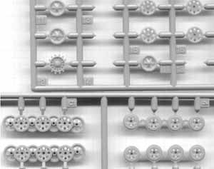 IV. The Suspension The Sd.Kfz.251 had interleaved roadwheels and rubber padded lubricated tracks common to most German halftracks of the time. In 1944 the Germans experimented and soon dropped the idea of steel padded tracks so as to save on scarce rubber. Both DML and Hasegawa have the correct 14 roadwheels; the rear roadwheel doubles as the idler wheel. Second from right are DML’s