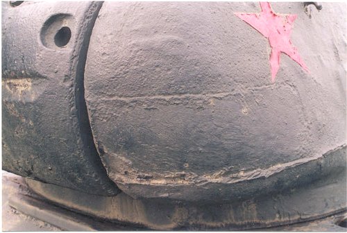 1. This photo is of the front right quarter of what appears to be an Angle-Jointed turret of Zavod 174 or a step-jointed Zavod 183 turret. Note the vague casting line coming back from the mantlet and angling back. Visible on the right (starboard) side is the pistol port and above that the loaders vision slit (not present on the port side). The turret lift point is a hook type typical of the 1944 and later turrets. The mantlet is a Zis-S-53 type. Note the significant gap between the gun barrel and the armored sleeve of the mantlet allowing the gun recoil back into the turret. Also note the four large bolts at the base of the barrel sleeve. The large hole left of the mantlet sleeve is for the 7.62-mm DT coaxial machine gun.