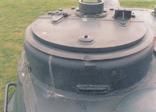 5. The turret's commander's cupola located on the port side of the turret roof. This is a single hatch cupola of the 1945 and later turrets. The hinge on the right has the stop that keeps the hatch vertical when open. Atop the cupola is the open-top Mark-4 periscope. The open-top periscope is what is featured on the Eastern Express 1/72 model. All the other injection molded and resin turrets in small scale have a closed-top Mk. 4 periscope. This hatch, atop the cast cupola, can be rotated so you may see the hatch open off the left or right as well as to the front. The hatch in this photo is rotated slightly to the right of center. This photo also shows us a great view of the bulge on the turret's left side in order to accommodate the larger cupola of the 1945 and later turrets. I have not seen this feature accurately portrayed in any of the small-scale models. This photo, and Photo #4 above give us good examples of Soviet welding of this period, at least at this particular Zavod (factory) at this time.