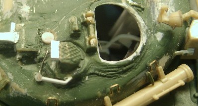 One final modification that I had to make to the turret concerns the main gun, the reshaping of the turret front now causes the kit gun not to fit properly, this can be fixed in two way. You can either blend in the existing kit piece to the turret front using putty, or you can as I did make a new canvas cover. I chose to make a new cover as beneath the canvas there is a small plate that can mostly show through, I chose to use foil and embossed the plate to the reverse side using the Part T-55 set (piece #46) with this lightly embossed onto the foil, I then cut the shape of the new canvas, I also removed the top of the moulded canvas that fit to the turret roof, the gun was then glued in place and the new canvas fitted around it and then all was blended together using putty. There is no fixed way of doing this and it is which ever method you find that suits you. After the canvas was fitted there is a small retaining wire that needs to be added to the turret roof, this runs around the top of the canvas and extends either side slightly, it is held in place by two brackets on the roof.
