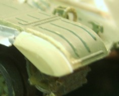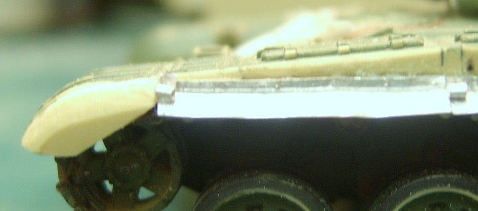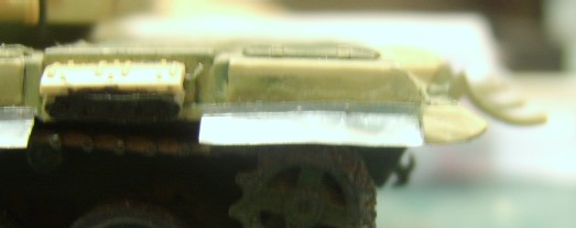 With the most of the hull and turret done, there are one or two other bits that still need to be done which are the side skirts. These can be made out of either plastic or metal foil, I preferred the foil because a, they have a nearly 90 degree bend in and with foil it is easier to show the attaching screws by simply making an indentation from the rear, not so easy are the front portion of the fenders although the kit piece can be used. I made mine out of a 4mm wide piece of foil from a metal food tray, one side is then bent up to around 60 degrees a distance of 1mm in, in the 1mm wide part the indentations are made on the reverse side. the front portion is taken from the kit side skirt, I added a 0.5mm thick piece of plasticard to the back, to make the front portion wider, this is then filed at an angle the same as the foil skirts. The other parts in the pictures are fittings for the swing out armour plates or Gill Armour as it was called.(missing from these pictures are the small square portions seen on the outside edge of the front fender) around the rear, the kit part has to be made smaller and also made to an angle, there is enough plastic to allow this. As you can see there is a gap for the exhaust. That about completes the changes made to backdate the Revell kit. The turret changes also apply to the ACE kit, as do the hull changes, although this is more difficult due to the fact that the ACE kit has the extra armour on the glacis moulded in place, making it difficult to remove. In future articles I will be correcting the turret for the T-72M, the T-72A(T-72M1) and the T-72B, and finally I will hopefully be able to fine enough material to make the T-90 welded turret, plus all the modifications needed to make a correct T-90. A note on the fuel barrels A quick note on the Fuel barrels, the Czechs devised a system for allowing the rear fuel drums to be fed directly into the vehicle fuel system by means of hoses linking each fuel barrel to the rear right hand fuel pannier above the tracks, this system was not adopted by the Russians and so it would be wrong to model any early Russian T-72 with this system, the reason being that the Russians didn't invent it and so disregarded it. However they are now getting over the fact that it was not invented by them and have started to use the system on their own vehicles, so it is worth noting when modeling a vehicle from a specific period in time, the system has so far appeared on the T-90 and Rogatka tanks but it is also possible that it has been retro-fitted to other vehicles. |