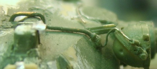 This leaves just the wiring for the rear marker light on the turret behind the gunners hatch, here the wiring comes out of the mounting pole and into the light.