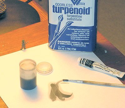 I consider painting scale models to be more than simply making a smaller version of the real item, because of the scale-effect. I approach modeling as a combination of painting a 3-dimensional object, and a 2-dimensional portrait of the same object. On 2-dimensional portraits, obviously the shadows and highlights need to be painted in, and the same holds true for scale models. Without the added dimension from highlights and shadows, the model looks too flat. Shadows Shadow is added to a model by means of a Wash. Washing a model in this context does not refer to soap and water, but rather the application of an extremely thin paint over the entire model. I am unsure of where the term "wash" originated for this technique, perhaps because the entire model is covered as though taking a bath? I don't know. The wash itself is so thin, that it is actually more of a darkened solvent, rather than a thinned paint. Its purpose is to recede into all of the hollows and recesses of a model, leaving the raised surface area relatively unchanged. As seen in the photo, it is so thin that when brushed onto a piece of white paper, is soaks in rapidly and very much appears as a water color.