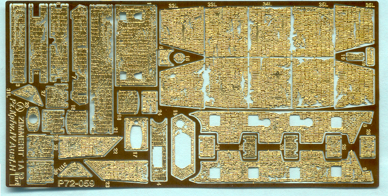Part makes a fret for both a new, virgin Pz IV, and for a battled scarred Pz IV; this is obviously the fret for a veteran tank with heavily chipped Zimmerit coating. The fret looks very complete with Zimmerit parts for the gun mantlet, the bow plates, lower hull sides, and the turret and hull skirting, etc.
