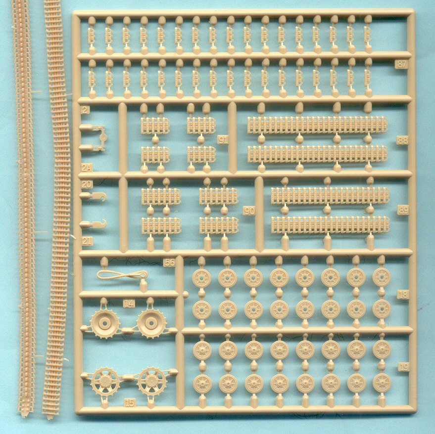 The small sprue at the bottom comes in the Pz IV J kit 3122 only and contains the cast idler wheels (parts 96 & 97) particular to the Pz IV Ausf. J and some late production Ausf. H tanks. These idler wheels replace the tubular idler wheel parts 16 & 17 which are for the Pz IV H kit or early Pz IV J. Left of the idlers are two new turret doors, which differ in having no view ports. Next are four hull skirt brackets (parts 100), some track links that mount on the hull side (parts 102), and the two flame suppressor exhaust pipes (parts 101) that replace the horizontal, cylindrical shaped muffler.