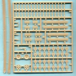 In the center are the turret parts molded in four main parts to DML's three turret main parts. The side doors for the turret (parts 73 & 74 or parts 98 & 99) mount into the rectangular depressions in the turrets sides (parts 63 & 64). If we wish to mount a side door open, we'll need to open up the turret side and add some interior detail to the small doors.