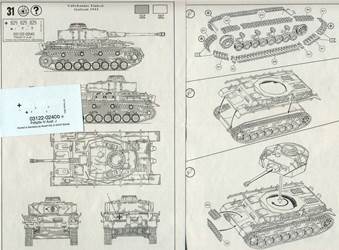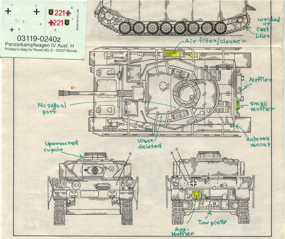 To better examine what makes a representative Panzer IV Ausf. H, I took notes on the Revell Pz IV H instructions. For me the identifying feature of the Pz IV H is the air cleaners on the starboard mudguard. At upper left is Revell's water-slide decal sheet for two Pz IV Ausf. H vehicles.