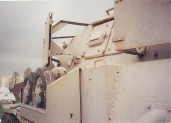 To left of the muffler is the small auxiliary engine muffler with two holding straps, another feature that disappeared with the Pz IV J when the turret traverse motor was deleted. Above the mufflers there should be one of the two hooks visible for attaching a folded town cable but it appears the hook has broken off its mounting plate. At the very bottom is the towing bracket.