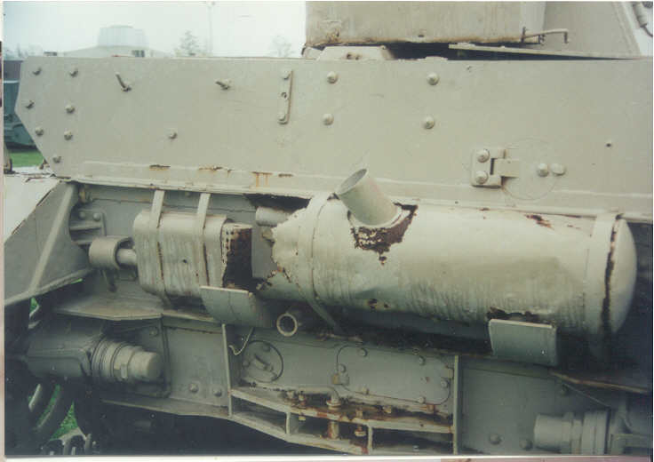 This last photo shows the rear of the Pz IV and is pretty characteristic of the Pz IV F through the Pz IV H. At bottom center is the towing attachment with the left and right idler wheel assemblies. In center is the large cylindrical muffler that looks original and rusted away at the left end so as to view the interior. The muffler is held on by two straps and by two supports that also hide the exhaust piping.