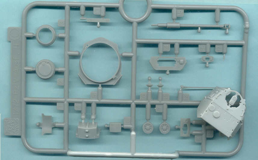 As evident by the title on DML's sprue-A here, this sprue is originally for a 1/72 kit of a rare variant of the Pz IV mounting an 8.8-cm Flak 37 gun and pedestal. Unused are the floor plate with the gun pedestal (part A4 in center) and part A6 at right. The handtools are molded to the mudguards like with the Revell kit. (Both manufacturers' kits would make better display models with separate tools.)