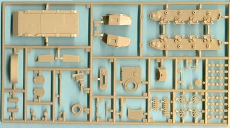 Revell's Panzer IV Ausf. J kit #3122 contains about 211 well-molded styrene plastic parts on four sprue; 46 of the parts are link & length track links. One sprue is different from Revell's kit 3119 and contains the cast idler wheels of the Pz IV J, spare track links, new turret doors, and the two exhaust pipes. Parts like the tubular welded idler wheels (parts 16 & 17) and the horizontal muffler (parts 3 through 6) are not to be used.