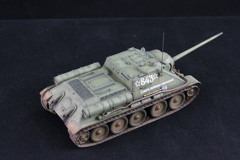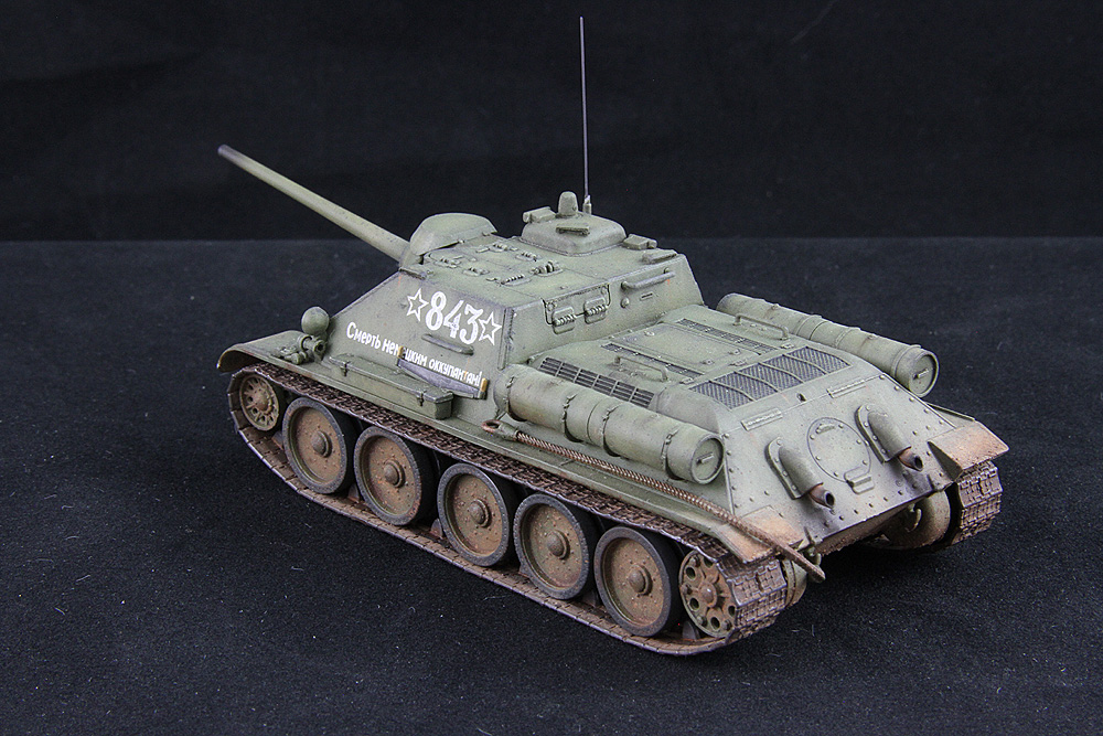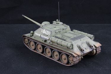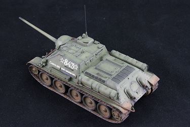 | This is Zvezda’s 1/72 SU-85, built pretty much out of the box with the exception of the head light lens from Little Cars. The kit was generally a pleasure to build except for the one piece tracks, which were difficult to impart the curve around the idlers, were a very tight fit when installed, and did not align well with the locating pins on the centre road wheels. |