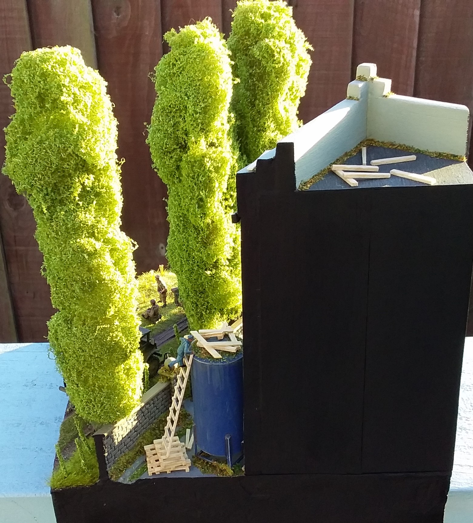 For the Poplar trees I used copper wire armatures covered in polyfibre and flock with trunks made of clay. The building is based on the Art deco style of the 30's and is made of balsa wood. I used balsa to make the cable reel, pallets, planks and ladder. The flowering grass tufts are baling twine and flock and the rest of the scenic material is by Woodland Scenics and Noch. To make