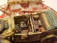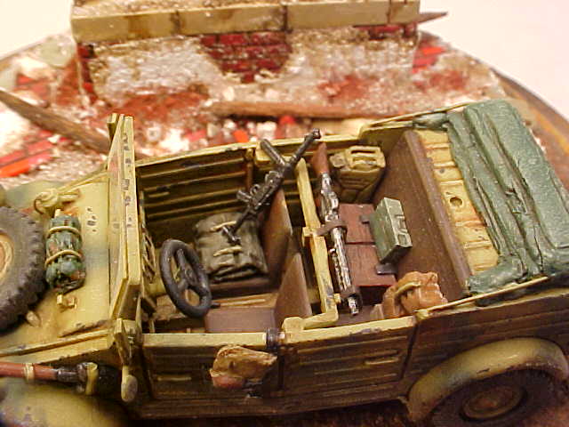 | Italeri 1/72 scale Kubelwagen. I detailed the interior with plastic, added the machinegun mount behind the front seats (the machinegun is from MMS) and the extra gear is from CMK. It was sprayed with Poly S paints and washed with oils. The soft cover is made from two part epoxy. The left front fender was replaced with lead foil and then damaged |