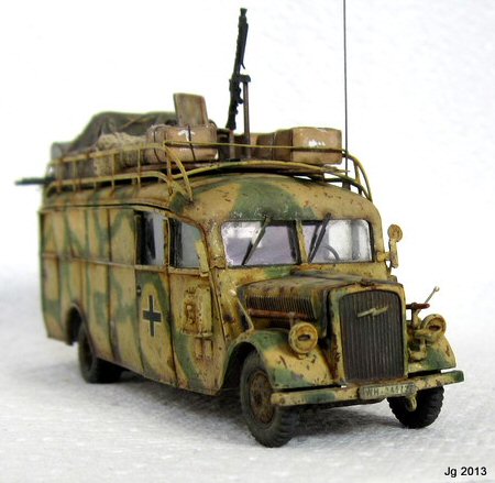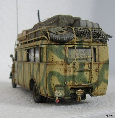Overall a finely detailed kit but difficulties lie forward of the firewall where a fiddly, multi-part front end assembly makes proper alignment extremely trying. The interior and roof rack allow for super detailing if one wishes, I treated the interior moderately. I spent many hours just to build enough stowage to fill the luggage rack! The model was constructed with a removable roof as I wanted the interior to be accessible. Flooring of the interior is stained wood - HO scale lumber - as well as the roof's forward platform. I added the MG34 on an improvised mount as I felt the bus needed some defensive capability, and things just look better with a gun.