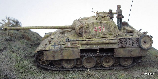 This is Esci my Panther A, which I built years ago then set aside to wait for better tracks to magically appear. They finally did, in the form of OKB Grigorov's Panther mid production resin tracks. These are magically superb castings, the quality is first rate. New tracks in hand, I added hot knife Zimmerit, schurtzen and a full complement of hangers, and fabricated the MG mount and other small parts. The yellow is acrylic sprayed, the green/brown mottle is artist's chalks, sealed with Krylon matte fixative. The figures are vinyl and added for scale effect. Let's just say the model represents a scene in Normandy as I wrote the actual unit info on the hull bottom, and the model is now affixed to the base. Most gratifying for me was finally finishing this model after two decades of sitting on the shelf and having it meet my expectations of both then and now. |