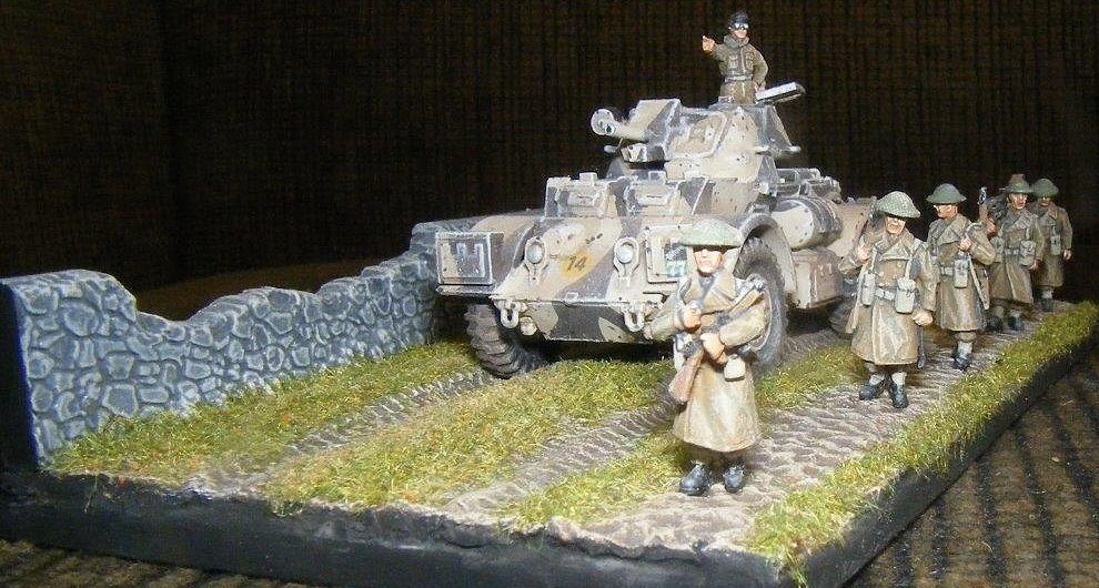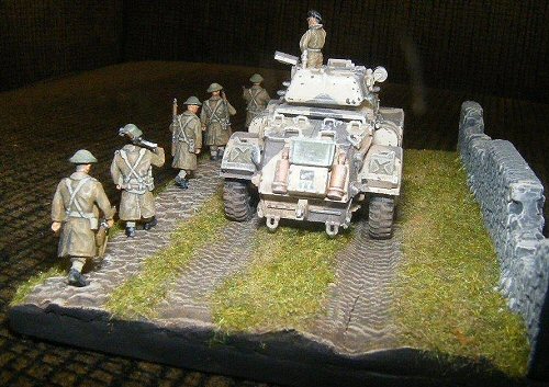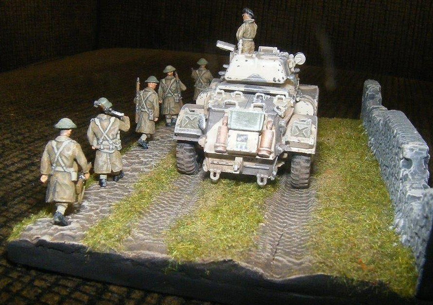 This is a Staghound Mk II of the 2nd New Zealand Armoured Division, Italy 1945 by RPM. The MMS commander figure had a huge right hand. I whittled it down as much as possible but it's still a bit big. Milicast make the walking infantry figures. I bought them for a "north west Europe 1945" diorama but it turned out their rifles are No1 mkIII SMLE's so they became Kiwis in Italy. The
