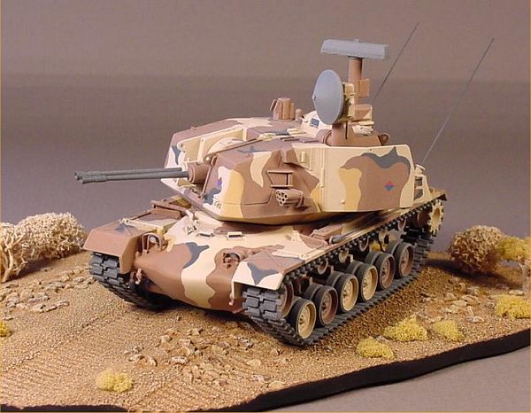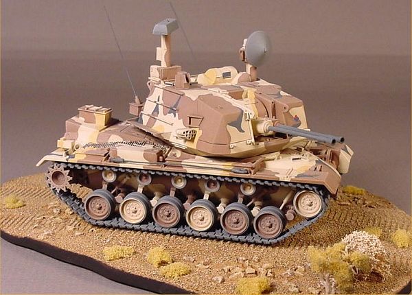 "The 1/72 Sgt. York is an ESCI M-48 A-5 chassis with a scratch-built turret, painted in the "Red Desert" MERDC scheme. I used the TAMIYA 1/35 kit as a guide. The turret is made of Evergreen sheet, bar, tube and rod stock, with brass and aluminum tubing and wire. All paint is HUMBROL, with Poly-S flat finish."