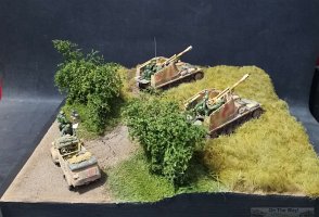 | This is my depiction of the counter-attack by the "Hitlerjugend" Division on Bretteville l'orgueilleuse, held by the Canadians in June 1944. The two self-propelled guns are from Esci, but the entire casemate was redone in plastic card. The howitzers are original Alby overmouldings, grafted with an Aber metal barrel and a "homemade" aluminum sliding rail. Finally, the tracks are from OKB. Figures are Caesar multi-poses. The section leader's Kubelwagen is an Academy with minor upgrades. |