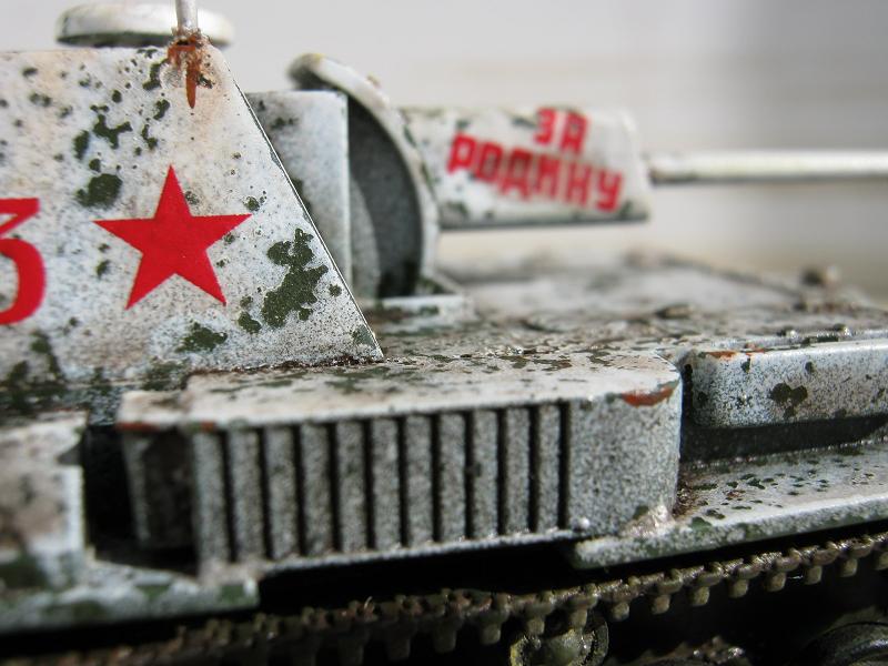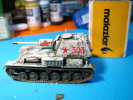 | This is the enclosed rear version of the SU-76 SPG. I found it to be a very nice kit. It was painted in Vallejo Russian green and I used the salt method to make the chipped winter camouflage. |