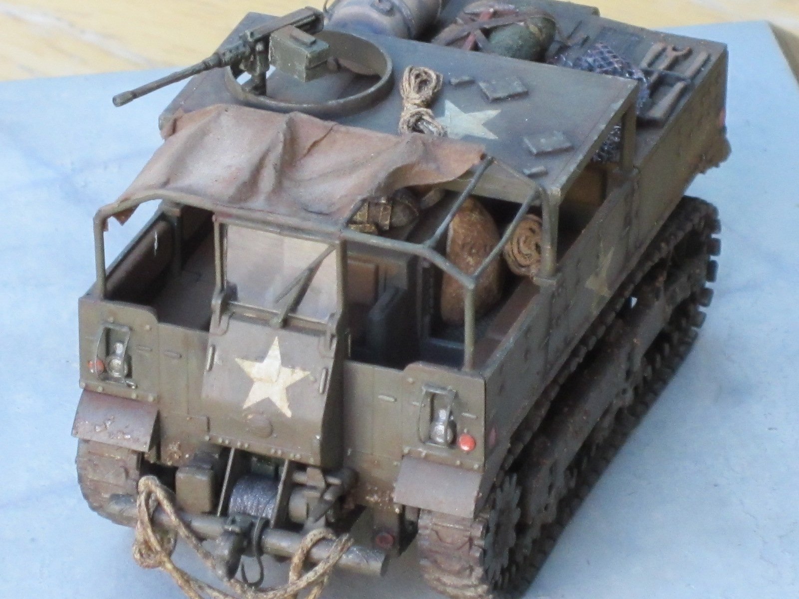 | After many years of gathering dust on the shelf, I finally decided to build this old Hasegawa M5 tractor which, despite its age, is finely molded and has nice details and parts fit. The kit's weakest link, so to speak, is the band tracks, but a hot knife and superglue keeps them together well enough. I replaced the plastic roof with a frame of wire and tissue paper. Other added bits include the window, wiper, light guards, ammo box and stowage. Something different: as I lost the decals, I brushed painted the US stars using a stencil made from paper, several layers of thin drybrushed white built up. With weathering they turned out nicely. This was a quick and enjoyable build, if you run across this model do pick it up as it still has a lot to offer. |