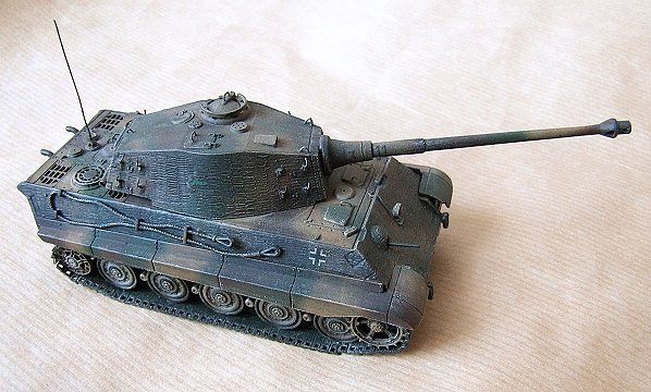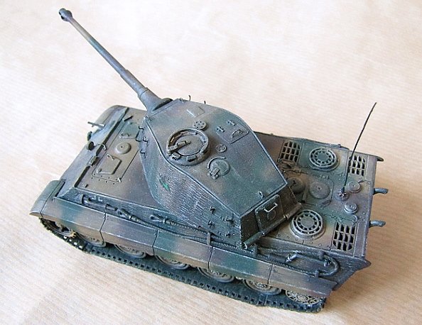 This ex-ESCI kit includes engraved zimmerit (the surface was softened with glue and the pattern pressed with an electrician's screwdriver). Hatch handles, lift rings, headlight cord and spare track holders are made of metal wire. Also the gun mantlet received some detailing. I stayed with the kit's original link-and-length tracks in spite of their crudeness, but I engraved individual link seams and added track guide teeth made of plasticard. The details on the turret roof were left slightly misplaced, however.