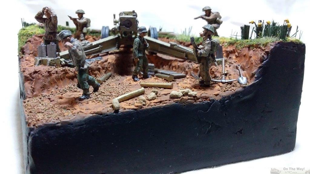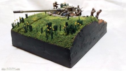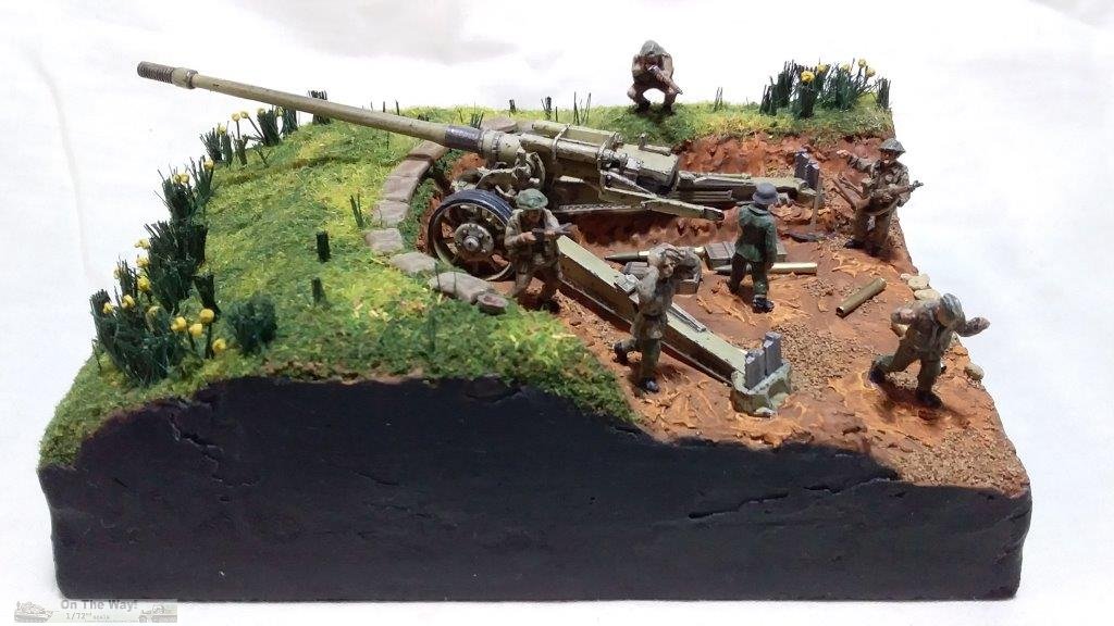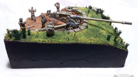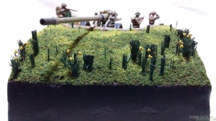 | The Kanone 81/2 is by Ace with an AB miniatures crew (from a POW set). The British figure pointing his hand is from the same set, while the other two are by PSC. Ammunition for the real K81/2 was two part but came as one piece in the kit. I left it that way because I like the look of big shiny "bullets". I made the Daffodils from electrical wire and slices of plastic insulation stripped from the wire, with some shop bought "reeds" for the leaves. Other bits came from the spares box. |