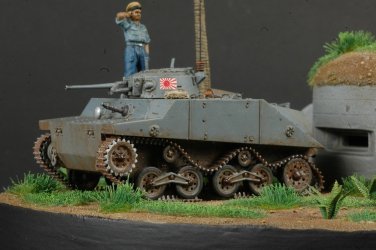| Olivier used the Dragon Ka-mi and Jeep, with decals from an old Academy GMC. The US Navy sailors are from Hecker & Goros. The bunker is from Italeri. |