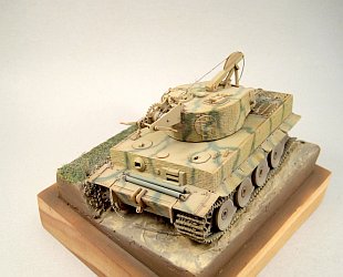 This was built for a club contest. One of our younger, long time members had diabetes and it finally caused his death... suddenly. The club auctioned some of his incomplete models for a contest, the proceeds of which went to the widow. We were to complete the models for the July 2011 meeting. My little Bergetiger took second place. When I received the model, it was all built except for the side skirts, road wheels and track. I don't like to build tracks, I'm not very good at keeping them straight and these old style Dragon tracks were reported not to like glue of any kind. There is some confusion as to the purpose of this modified fighting vehicle. Googling, I found a photo of the "real thing" abandon by the road and on the front was a tow bar and fitting not found in the kit. So I assumed this was indeed a recovery vehicle and that the light weight crane was to help lift and move track and road wheels. Anyway, the photo showed one run of track gone (yeah!) and I decided the Germans had stripped most of the other track and all removable equipment on the deck. I built and added the fitting to the glasic plate then built a tow bar and its fitting. The crane was modified to match closeup photos found on Google. I drilled out the solid webbing on the drive sprocket, very easy to do with a Dremel and small bit. Since this was just for the club I didn't make any more mods or try for super detailing. The paint is a typical Italian theatre scheme and the weathering is as if the real vehicle had been sitting there long enough to collect a heavy coat of road dust. The base was for practice as an experiment in making scenic bases. The tank is attached with a hefty screw through the bottom, accessed by removing the turret. Except for the old style tracks, this was a very nice kit, but I had to shim out the return/idler wheel because it didn't line up with the track. The zimmerit is very nicely done. |