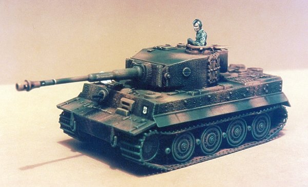 "It's a Hasegawa Tiger I (the old kit) with the running gear and tracks from the ESCI King Tiger. I completed this a few years ago now, before the new Tiger kits or the Revell Tiger was available. The Zimmerit was done with a Motor Tool and was a lot easier and less complicated than it may look. Both crewmen - there's a driver on the right - are from the Hasegawa Groundcrew set."