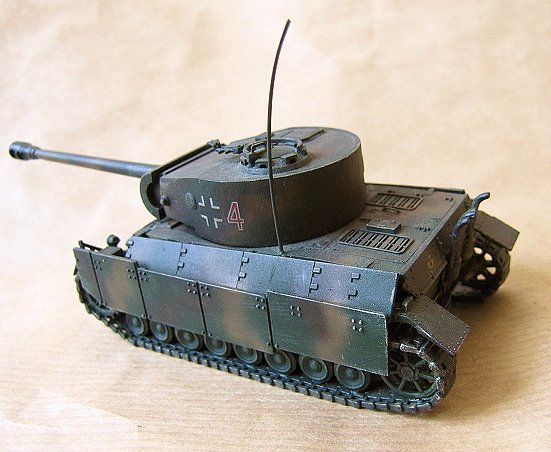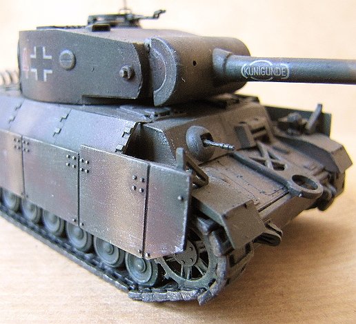 In true life the model is a "German" tank that never was and never could have been either. I am not at all sure if the 122mm gun would have fit the Tiger turret, and it is certain that Panzer IV chassis could not have housed that wide and heavy turret let alone move about with such enormous, front-heavy weight. What you really see here is a fun project to take advantage of a pile of left over and spare kit parts that were lying around after more serious projects. It consists of a PST 122mm gun housed in a Revell late Tiger E turret with a Panther mantlet, and then attached to a Revell Panzer IV chassis with Revell StuG IV wheels and tracks. The hull front panel belongs to a Tiger and is tilted to an abnormally steep angle. Extra armor includes side plates from a Revell Panther and a Matchbox Jagdpanzer. The exhaust set belongs to a Revell Panther and the gun travel lock is taken from an old Matchbox U.S. howitzer. This entertainment project was a fun build with very relaxed authenticity standards and included no serious background study whatsoever. Despite the practical and historical impossibilities I personally like the looks of this little monster, which to me resembles somewhat a T-34/85 blown out of proportion.