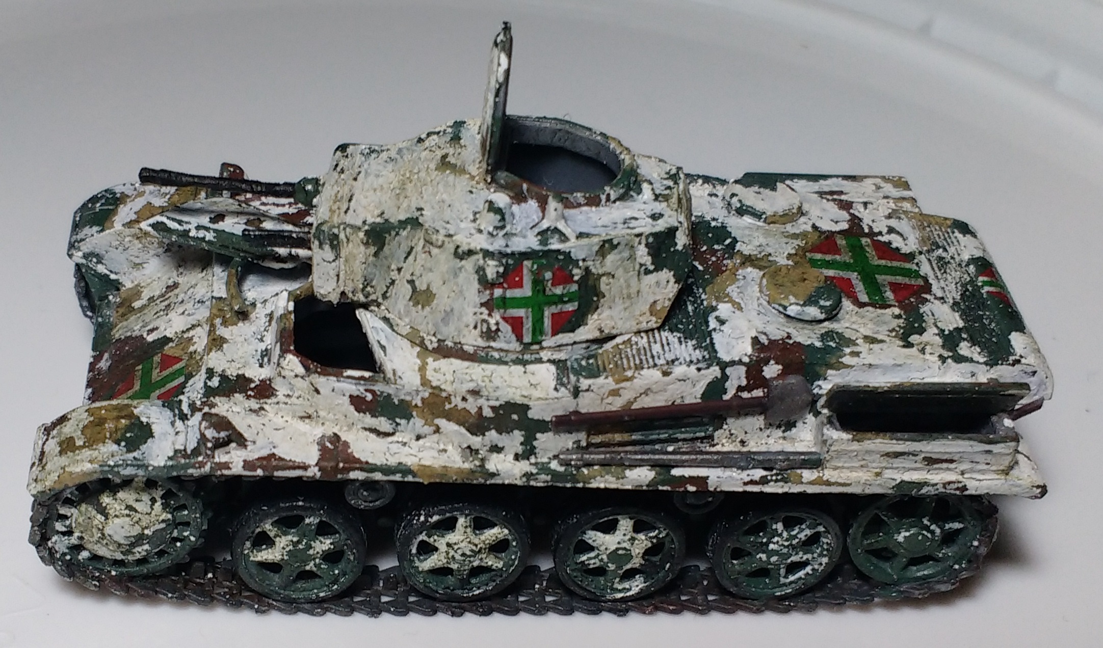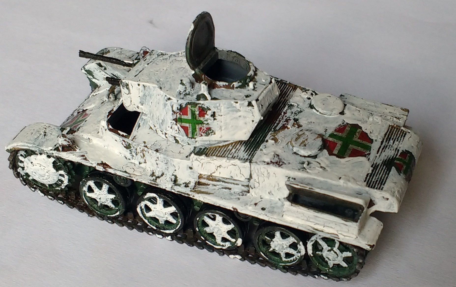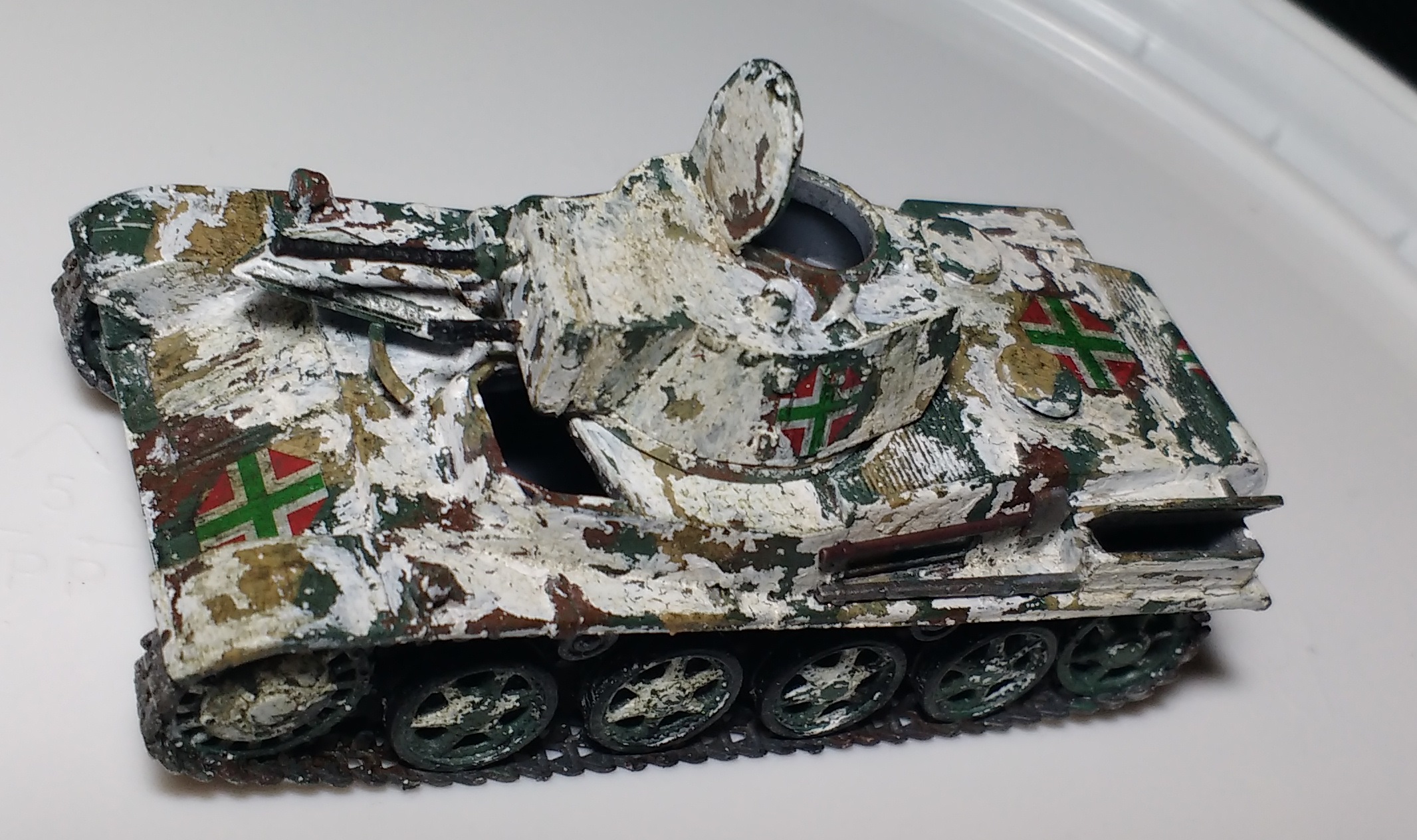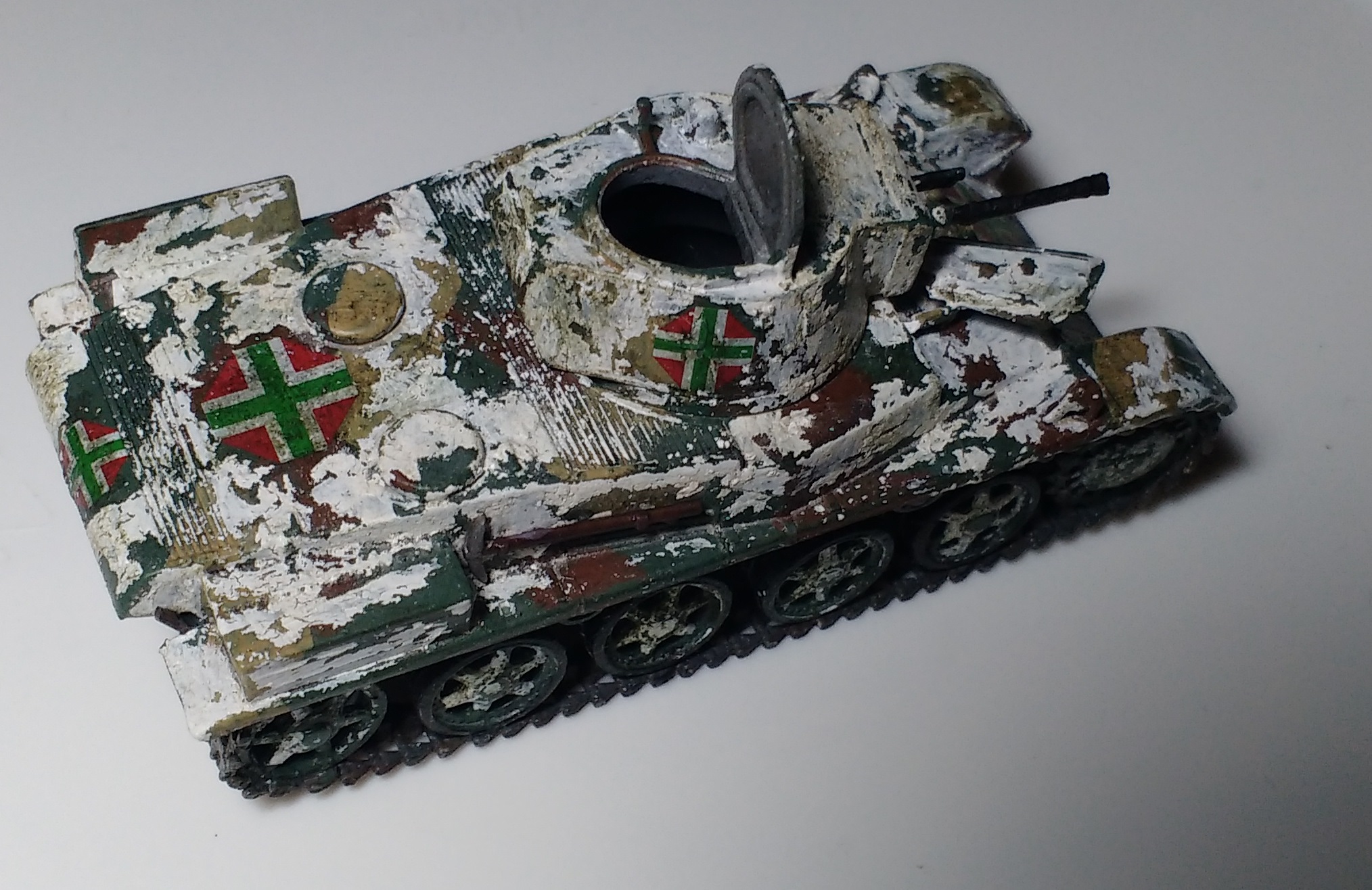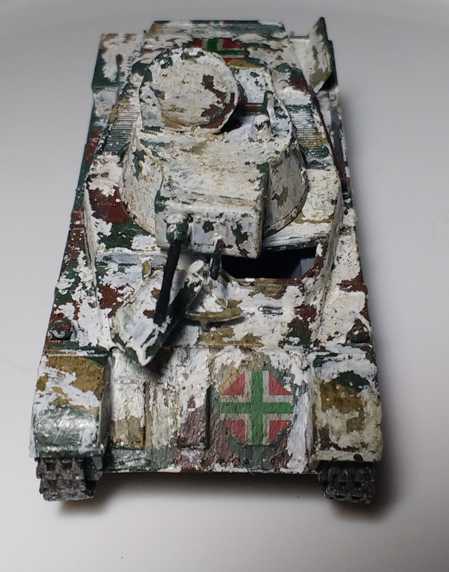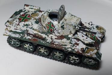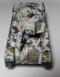 The model was painted in a 3-tone camouflage, then recived some late-autumn weathering. Winter camouflage was not very durable, so I made a heavy chipping effect (Ammo-Mig Jimenez Heavy Chipping Effects + XF-2 Tamiya). A single photo shows a white painted tank before it was scratched.