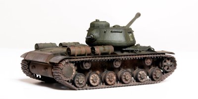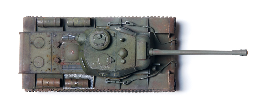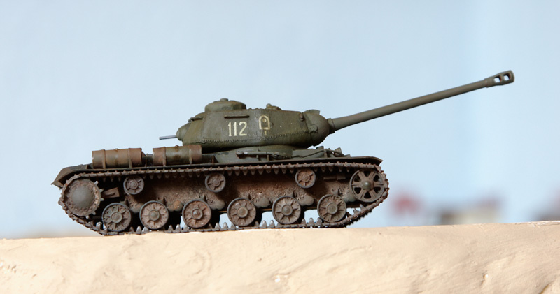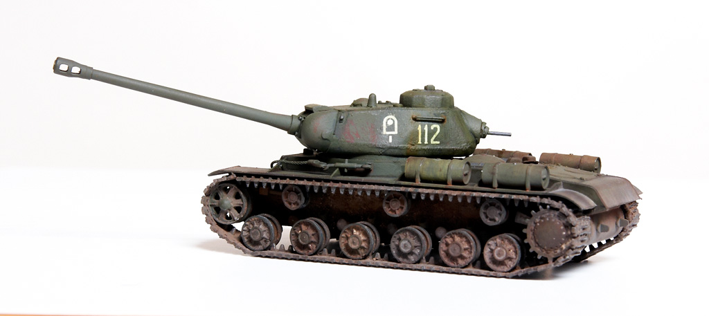 The kit handrails were replaced by wire, gun barrels drilled out and the main gun replaced by the Aber 122mm D-25T (72L-04). The tow cables are by Eureka. After grey primer, the base undercoat was a mix of Citadel Dark Flesh (to replicate Red Primer) and Tamiya Nato Black in different sections. The base coat was a mix of Tamiya XF61 + XF65 at a 2:1 ratio. This was then covered with AK Light Chipping Fluid so that I could reveal small sections of the Red Primer undercoat, etc., although some sections then disappeared under the weathering process. Some fuel stains and spillage added with AK Fuel Stains. I attempted some cast texture on the turret and the weld seams using Mr. Surfacer. Various Mig Mud Pigments were also applied. This kit was a joy to build as it went together very well, with minimal clean-up. |