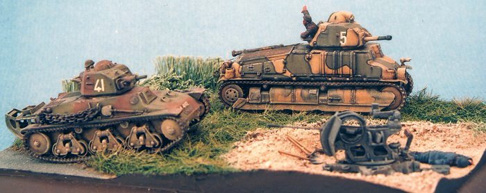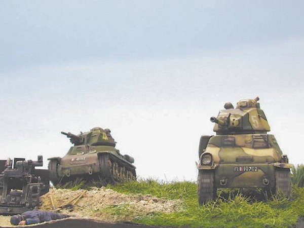 Hotchkiss 39 and Somua S35 during the battle of Abbeville, May-June 1940. They belong to the 3ème régiment de Cuirassiers, in the IVe Division Cuirassée (DCR) of Colonel de Gaulle. The kits are Al.By. The little gun is the German 20mm Flak 38, from the same French artisan. The soldiers came from transformed Preiser figurines.